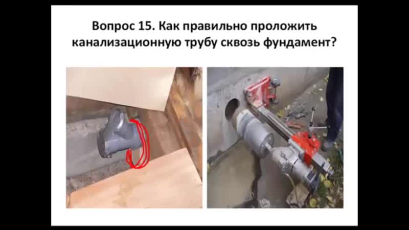 По технологии прокладки канализационных труб уровень прокладки должен быть ниже уровня промерзания земли, для каждого района уровень промерзания индивидуально свой. И вот тут встает задача — как при минимальных повреждениях фундамента максимально точно сделать сквозные отверстия для последующей прокладки канализационной трубы. Оптимальный способ «прокола» фундамента — способ алмазного бурения: при этом способе фундамент остаётся неповреждённым. Ещё одно важное преимущество алмазного бурения — возможность сделать отверстие под любым углом: угол в этом случае необходим, чтобы в канализационных трубах не было застоев сточных вод.