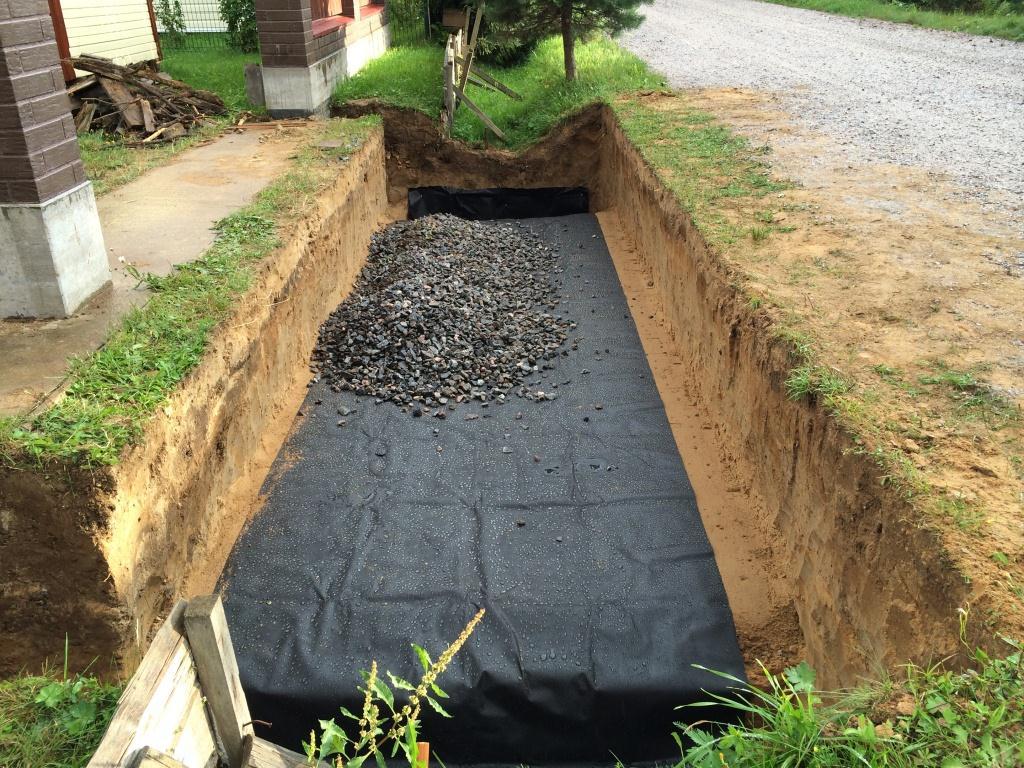 6. Поверх трубы насыпается 30 см гравия (фракция 70) и трамбуется. Затем еще слой того же материала, но с меньшей фракцией и снова трамбуется. Если высота позволяет нужно уложить 3 таких слоя (самый последний еще меньшей фракцией).