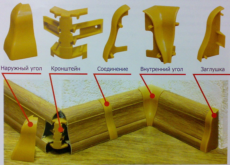 Для таких напольных плинтусов выпускают специальную фурнитуру. К ней относятся: