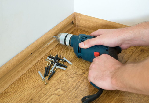 - Плинтус прикладывают к стене, в приготовленные отверстия крепко вкручивают саморезы.