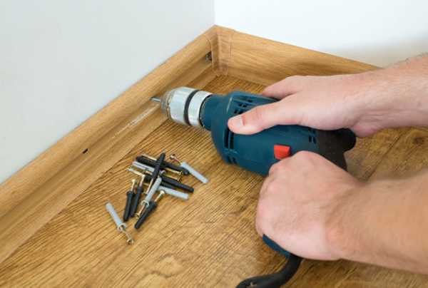 Вне зависимости от выбранного типа плинтуса, монтаж производится по однотипной технологии, предусматривающей использование дюбелей и шуруповерта, при помощи которых выполняется крепеж задней стенки плинтуса к поверхности стены.