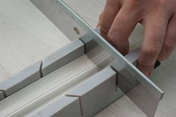 Для обрезки плинтусов используйте ножовку со стуслом. При этом, два плинтуса устанавливаются под прямым углом и выполняется разметка для образования между ними внешнего или внутреннего угла.