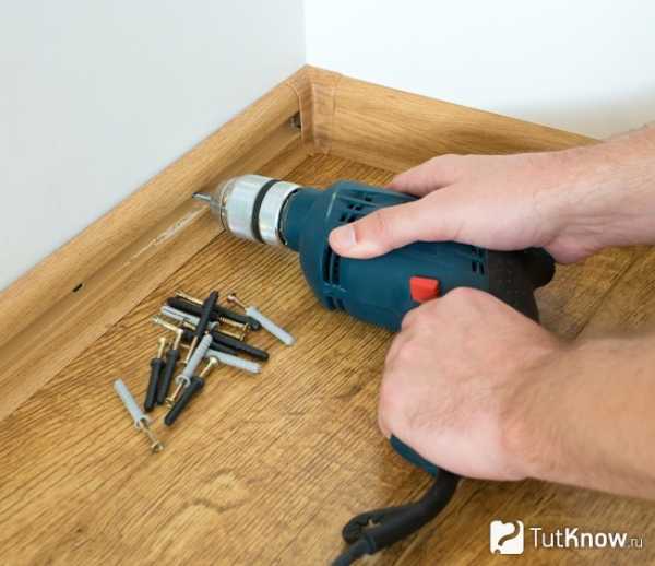 - Затем плинтус убирается, и по разметке делаются отверстия.