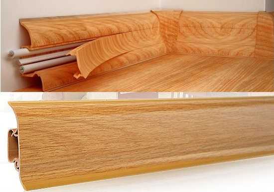 Сравнивая деревянный плинтус с пластиковым, первый не имеет специальных фурнитурных элементов, которые облегчают монтажный процесс. Поэтому, все соединения производятся качественно, а все углы должны быть идеально ровными.