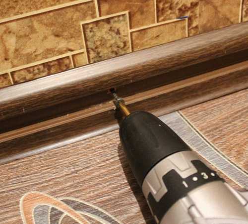 - В плинтусе просверливаются отверстия под саморезы с шагом примерно 30 см. Если устанавливается пластиковый плинтус, то его нужно разобрать на две части. Внутренний элемент надо будет закрепить на стене.
