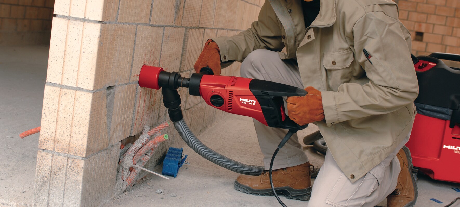 Этот человек может держать пылесос рядом с отверстиями, чтобы убрать лишнюю пыль и мусор после сверления. Это может помочь сохранить область в чистоте и убедиться, что вы не вдыхаете бетонную пыль.