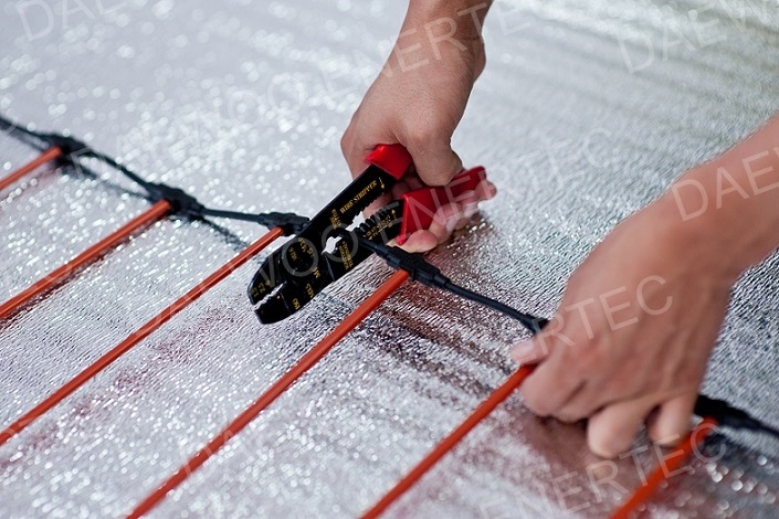 Как правило, чтобы подключить кабель к терморегулятору достаточно бывает примерно 4 м силовых проводов. Если все же «холодных концов» не хватает, то из мата вырезают нагревательный кабель. Соединяющая муфта при этом должна непременно находиться внутри стяжки.