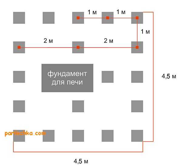 - Таким образом, соблюдая чертеж, вбиваются четыре колышка, соединяя их шнуром. Так формируют внешний периметр.