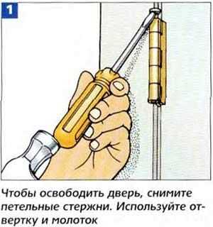 Шаг второй. После этого нужно снять полотно с петель, положить его на ровную поверхность (желательно на козлы или большой стол) и демонтировать всю фурнитуру, которая будет мешать дальнейшей работе.