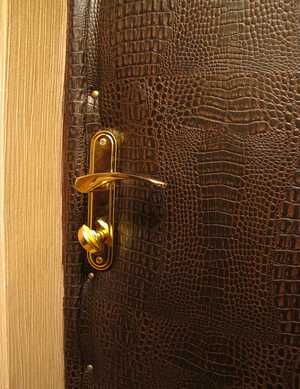 Итак, что такое валики, из чего их изготавливают? Изготавливают их из того же материала, чем была обита сама деревянная дверь. Обычно это дерматин или кожа (искусственная или натуральная – у кого, на что хватает денег). Из обивочного материала своими руками вырезаются полоски, их длина должна быть чуть больше, чем стороны дверного полотна, к которым они и будут крепиться. Ширина полосы зависит от ширины предполагаемого валика, то есть, будет зависеть от вас. Но стандартный традиционный размер – 5-6 см, поэтому ширину полосы выбираем 10-12 см.
