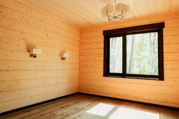 В дачном домике, выстроенным из бруса, можно обшить такой доской не только стены помещений, но и места дверного проема.