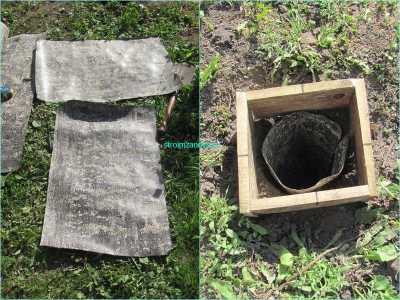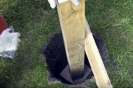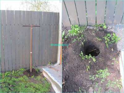 - Подготовка скважин. Строительным буром на 25 выкапываем отверстия в грунте на глубину до 0,7 метров. Можно воспользоваться обычной лопатой. На дно выстилаем слой рубероида, закрывая и боковые стенки ямы. Это поможет избежать протечки цементного молока в грунт и в дальнейшем защитит конструкцию от воды и коррозии.
