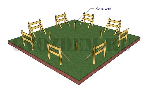 3. Натягиваем первую бечевку (точки 1,2). Крепить ее будем с помощью колышков. Главное чтобы колышки крепко держались в земле и при натяжении нашей конструкции их не увело. Этот важный момент нужно учесть.