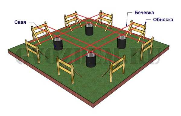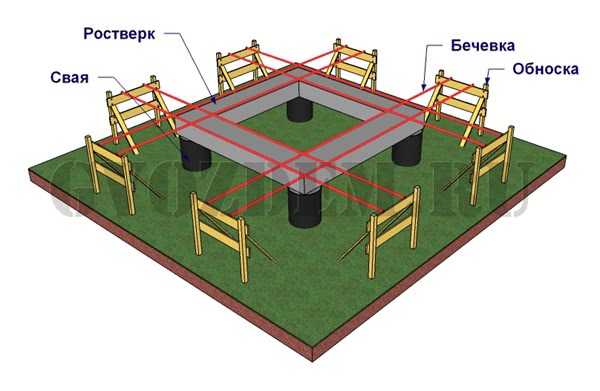 Немаловажным моментом является разметка будущего фундамента. Важно правильно выставить углы и замерить размеры диагоналей.