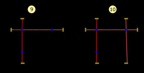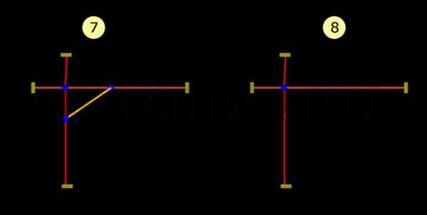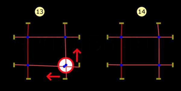13. Чтобы получить четырехугольник с прямыми углами в нашем случае необходимо, чтобы обе отметки на третьей и четвертой бечевках совпали. Для этого перемещаем обе бечевки до момента соединения отметок.