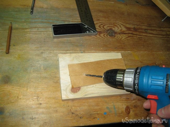 - Просверлите небольшое отверстие по отметке — сверло должно быть тоньше стержня.