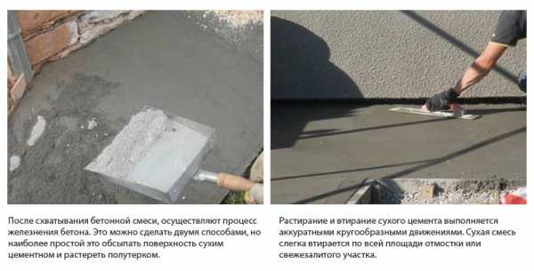 После схватывания бетона, обычно через 3 – 6 часов нужно через сито просеять на еще мокрую отмостку слой чистого цемента или специальной смеси для железнения толщиной от 1 до 2 мм, после чего его «затереть». Если поверхность высохла, ее нужно обязательно смочить.