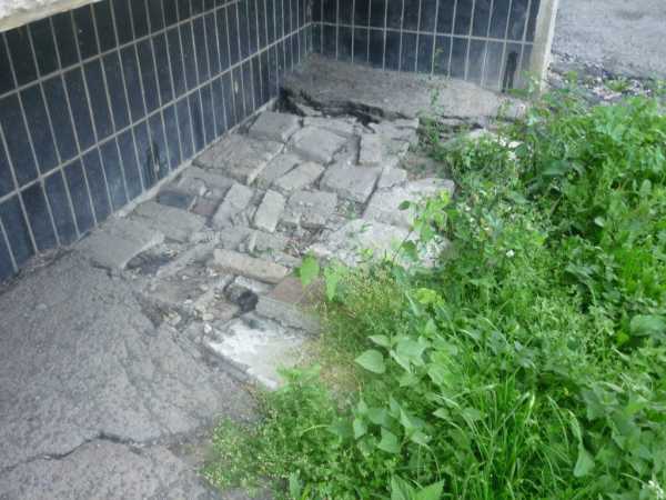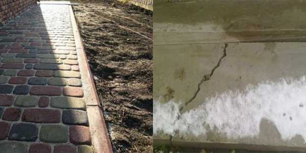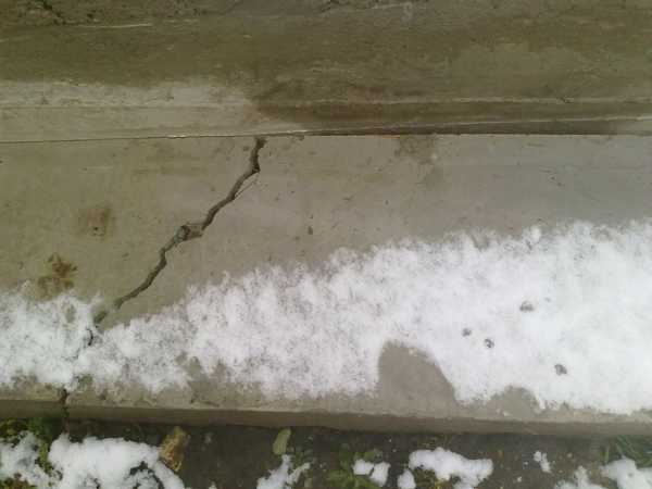 Дефектов в этих конструкциях можно насчитать множество. Например, тонкий слой бетона без армирования кладочной сеткой и без ограждения бордюрными блоками, отсутствие простейшей водоотводной канавки. Результат – вода не стекает в ливневую канализацию, а попадает под внешний край, замерзает и отламывает часть края.