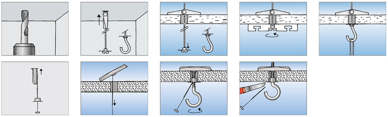 - Потолочный анкер, анкер-крюк, анкер-кольцо. Подбирается сверло, соответствующее диаметру анкера, делается отверстие, крепеж вставляется, элемент затягивается.