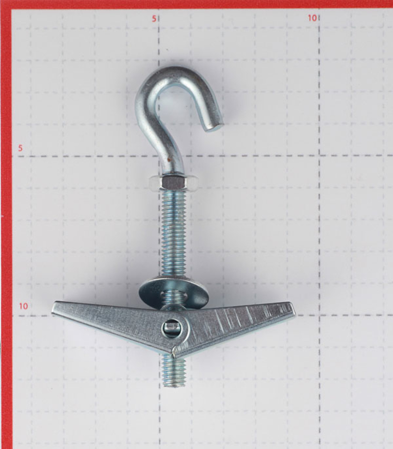 - Дюбель складной пружинный с кольцом, штангой, с крюком. Сверлится отверстие согласно диаметру элемента, вставляется крепеж, закручивается. В таком случае иногда используют строительный раствор штукатурки для большей надежности. Отверстие наполняется смесью и после этого устанавливают дюбель. Дается время на застывание.