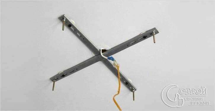 Планка для фиксации и крепежные элементы для нее идут в комплекте с лампой. Но лучше купить более мощные дюбеля. Это будет более надежный вариант, особенно если вы не особенно уверены в том, что точно знаете, как повесить люстру на бетонный потолок. Дырка под каждое отверстие сперва размечается карандашом. Сверлится, вставляются дюбеля, прикладывается планка фиксации и закрепляется саморезами. В этом методе крепления также можно использовать строительный раствор для большей прочности крепления. Важно до фиксации планки накрутить болты на нее для крепления люстры. Крестовая планка монтируется аналогично.