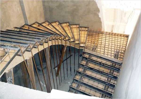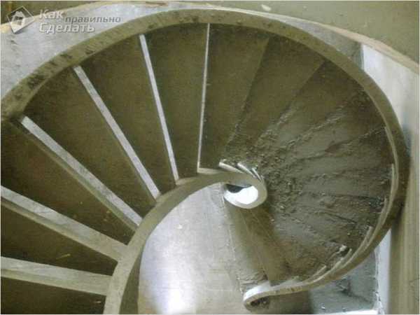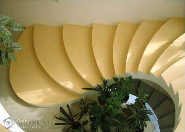 Классический вариант полностью монолитной конструкцииВторой вариант является металлоконструкцией сложной формы (каркас) с бетонными ступенями. Каждая ступенька отливается с применением опалубки и армирующей сетки, а в качестве стройматериала применяется мраморная крошка и гранитный щебень. Высохшая поверхность полируется.