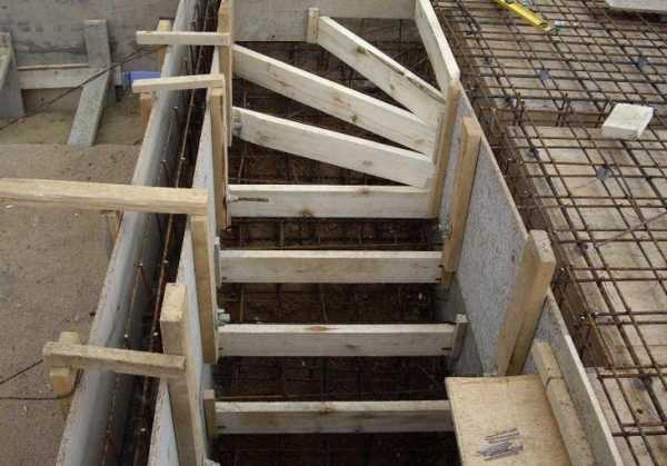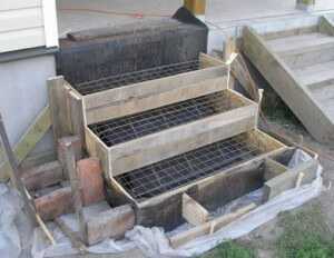 Перед тем как начать укладку бетона, проводим тщательный осмотр собранной опалубки. Перепады высоты ступенек ни в коем случае не допускаются.