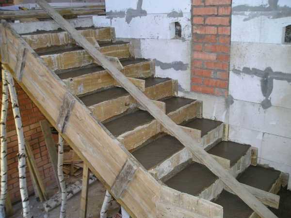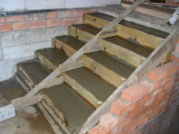 Сначала заливаем и формируем 2-3 нижние ступеньки лестницы. Особенно это важно в том случае, если бетон имеет жидкую консистенцию.