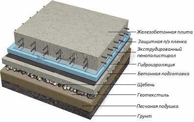 - Бетонная подготовка. Заливаются 10 см бетонной стяжки с цементным раствором марки М100. Затем бетон обрабатывают битумной грунтовкой (60% солярка, 40% битум).
