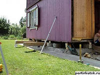 В открывающиеся зазоры по мере их увеличения вставляются поддерживающие предметы: балки, кирпичи, блоки по всему периметру. Таким образом можно оторвать от земли деревянные дома из бруса, бревна, деревянных панелей. Эти материалы и способ их крепления между собой способны компенсировать незначительные перекосы, которые возникают в процессе работ, и дом не рассыпается.