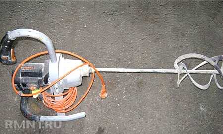 - Ручной строительный миксер. Этот прибор похож на предыдущий вариант своим устройством и принципом работы, но имеет ряд существенных отличий. Он оснащен электродвигателем большей мощности, поэтому способен выдерживать более длительные нагрузки. В его комплектации имеются насадки различной формы (плоские, спиральные или комбинированные), что позволяет перемешивать раствор в различных направлениях. Работу можно существенно облегчить с помощью фиксатора кнопки пуска, который имеется у большинства моделей. Это позволяет не удерживать кнопку и держать прибор за боковые ручки, меняя его положение на более удобное.