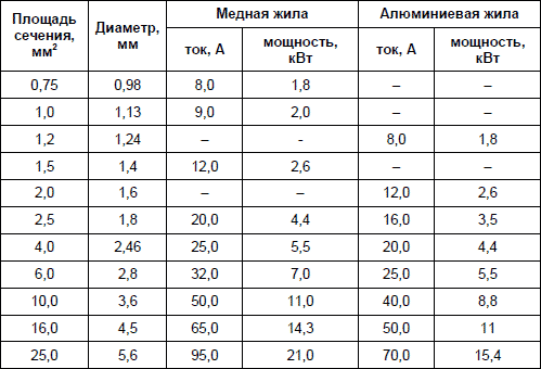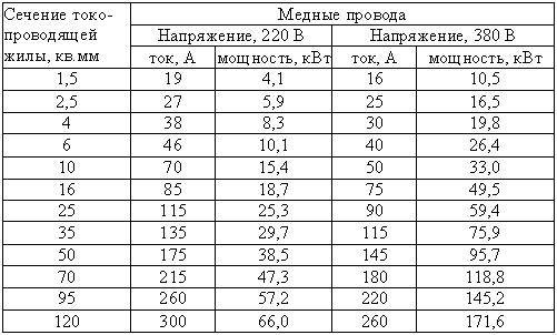 Таблица расчета нагрузки медных проводников