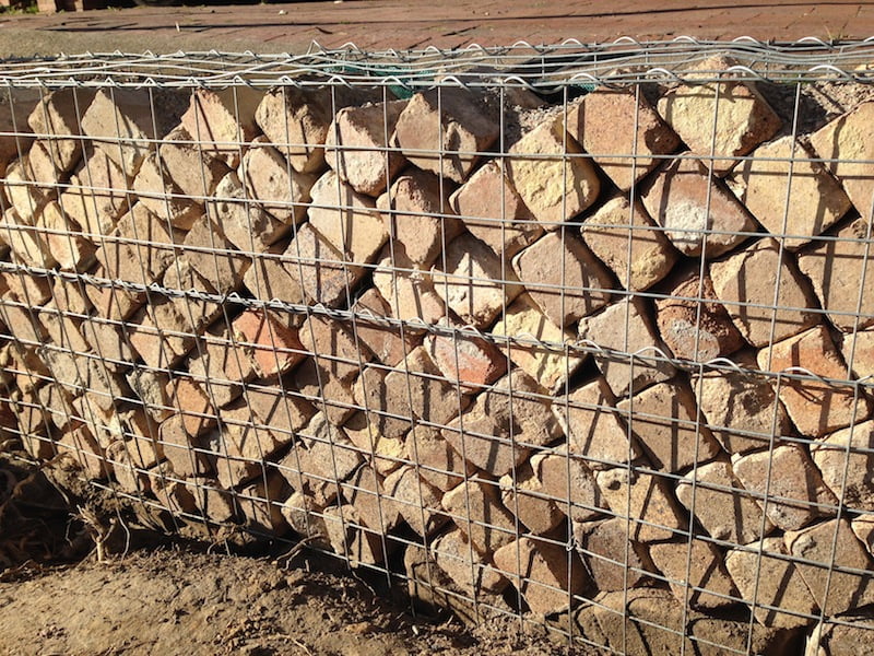 Особое внимание следует уделить выбору наполнителя. Сетку можно заполнить не только камнями, но и битым кирпичом, галькой, песчаником, гранитом, щебнем, стеклом, деревом.