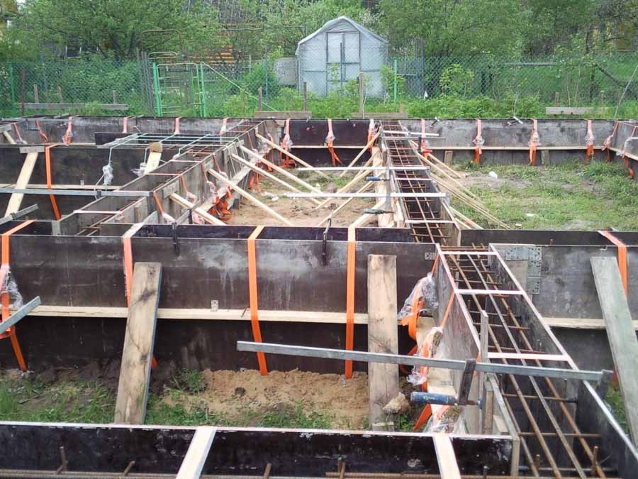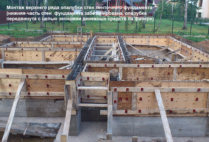 Строительство ленточного фундамента начинается с нанесения разметки на строительной площадке. Далее изымается грунт, монтируется опалубка, заливается бетон в армированный каркас.