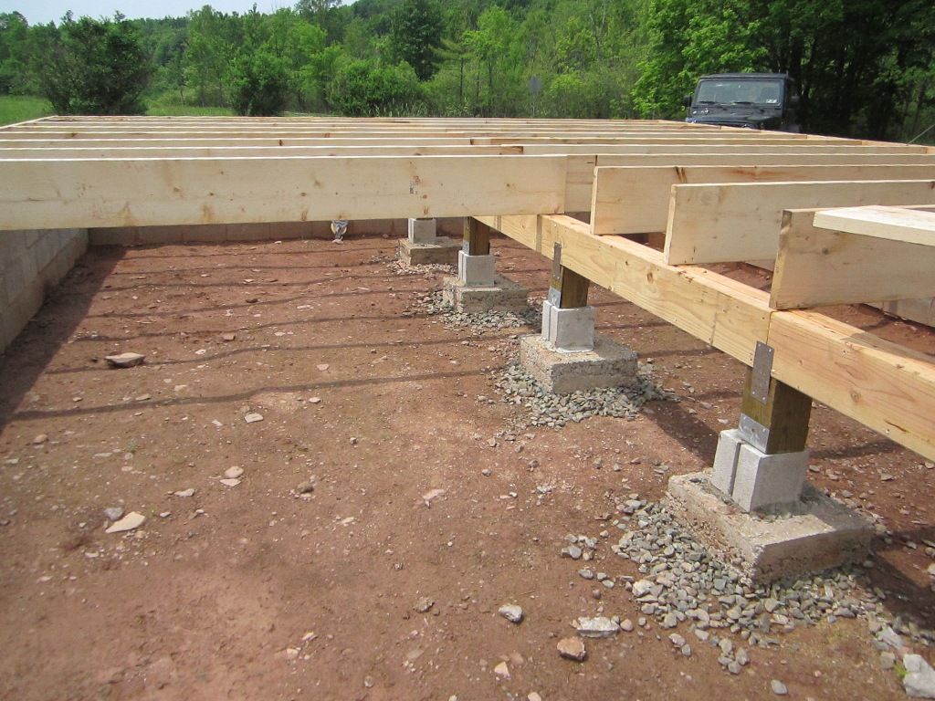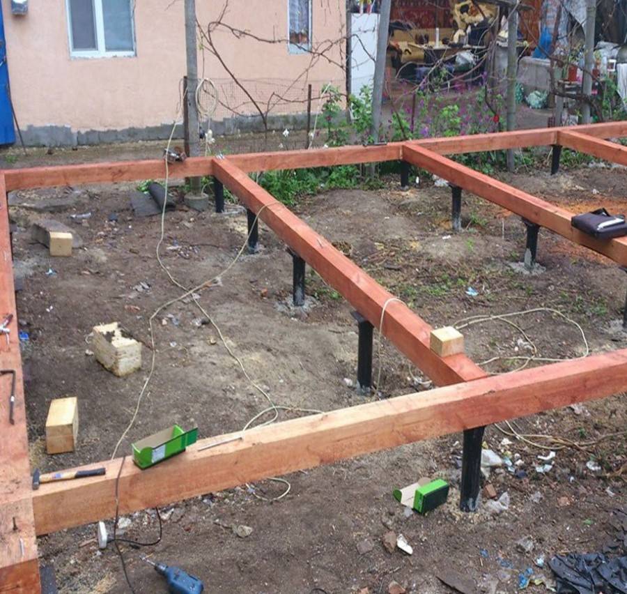 Каркасные строения опираются на обвязку фундамента, выполненную из швеллера или бруса. Ширина бруса чаще всего не превышает 15 см.