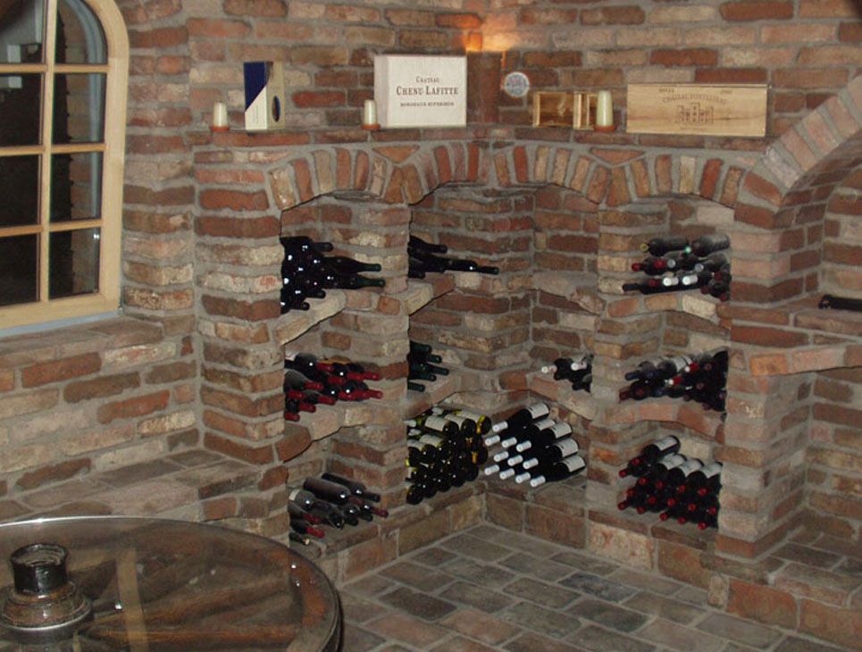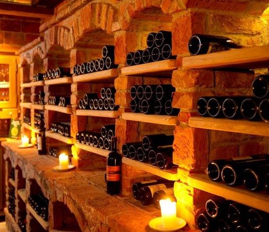 Винный погреб, состоящий из кирпичных стен и потолка, напоминает пещеру.