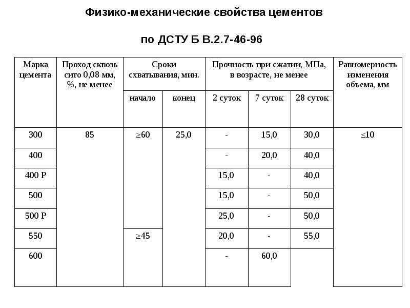 Также цемент классифицируют по прочности.Марочная прочность цемента является одним из главных показателей качества.
