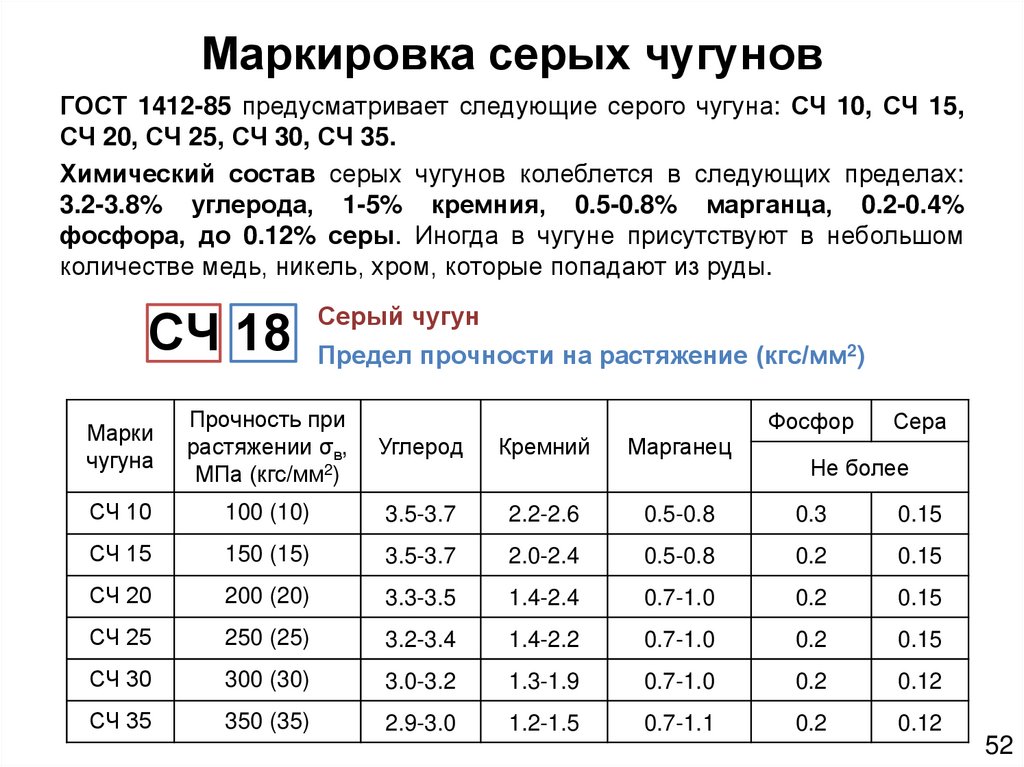 По ГОСТ 1412-85 буквы «С» – серый, «Ч»- чугун. Двузначная цифра соответствует пределу прочности при растяжении σв МПа.