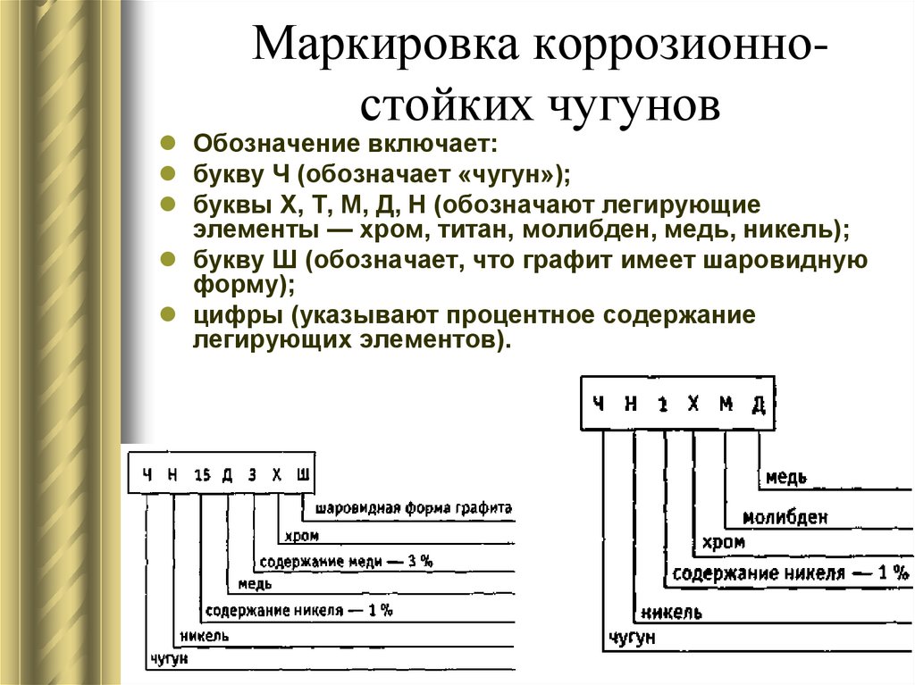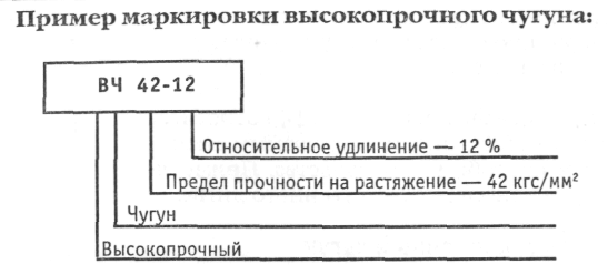 Условное обозначение марки включает буквы СЧ — серый чугун и цифровое обозначение величины минимального временного сопротивления при растяжении в (Н/мм2) х10-1: