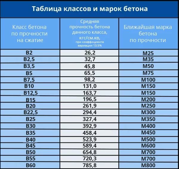 Так как прочности нескольких образцов одной и той же марки бетона могут отличаться друг от друга в большую или меньшую сторону, а так же каждой из этих марок принадлежит некий диапазон марок бетона по другим его характеристикам, например по морозостойкости, существует 15 разновидностей классов бетона, которые учитывают все его характеристики.