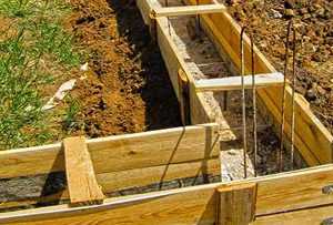 В северных районах глубина котлована может быть даже полтора метра. А, например, в средней полосе — 50-70 см. В уже выкопанный котлован небольшим слоем, насыпают подушку из песка. Желательно использовать крупнозернистый песок. Вдоль стен котлована и на самое дно укладывают гидроизоляцию. Затем производят закладку арматуры, а металлические прутья между собой перевязывают проволокой. Готовая опалубка должна выступать над уровнем почвы. Обычно для изготовления опалубки используют доски , но иногда и другие материалы (шифер, листы металла, ДСП). Затем непосредственно приступают к заливке котлована.