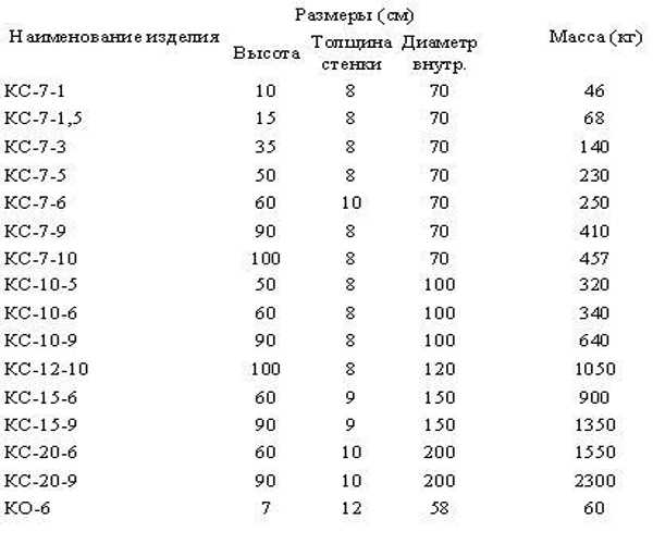 Таблицы размеров бетонных колец согласно ГОСТ. Технические характеристики
