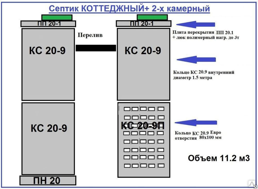 Перед покупкой бетонных и железобетонных изделий необходимо выбрать оптимальную конструкцию очистного сооружения и точно определиться с размерами и количеством элементов. Эффективным вариантом является строительство переливного септика из бетонных колец, состоящего из двух колодцев (камер), каждый из которых выполняет определенную функцию: