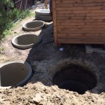 Устройство канализационного септика под ключ на даче из колец 1.5 метра диаметромЕсли необходим более производительный и объемный септик, можно установить кольца диаметром 1. 5 метра – тогда для их монтажа применяется подъемник, в виду большего веса секций.