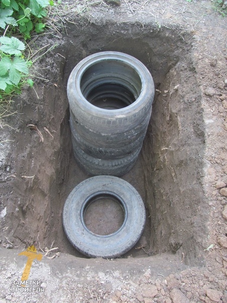 Яма, куда один на один уложены автомобильные скаты. Плюсы этого примитивного выгреба: предельная дешевизна и простота.