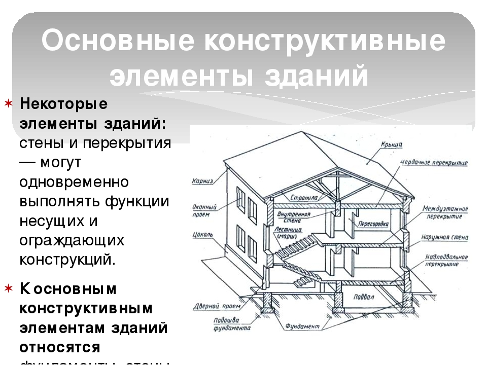 Здания и сооружения подразделяются на жилые, общественные и производственные, и имеют определённые конструктивные элементы.