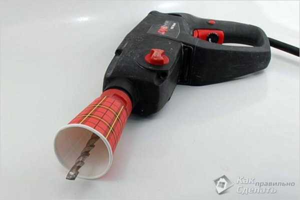 Перед тем как начать сверлить, позаботьтесь о том, чтобы пыль и песок, не попали в патрон перфоратора. Для этой цели можно натянуть на сверло одноразовый стаканчик, или половинку резинового мячика, а потом сверлить.