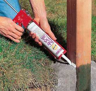 - Основание столба на стыке с бетоном следует обработать специальным герметиком, предназначенным для работы с бетонными поверхностями.