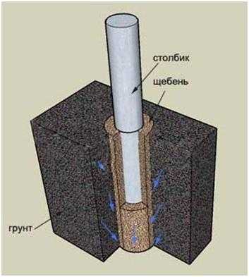 Важно знать! Если забутовать опорные столбы, грунтовые воды будут беспрепятственно проходить через подушку из песка и щебня Благодаря этому даже на самом сильном грунте опора будет стоять действительно надежно. Лунка же закрывается цементным раствором, чтобы предотвратить размывание подушки и расшатывание опоры в процессе установки полотна забора и дальнейшей эксплуатации последнего.