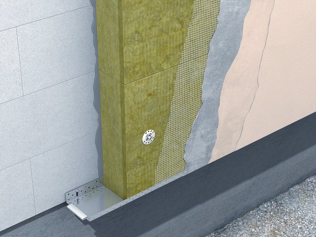Даже если цоколь не идет вровень с стеной, в одной плоскости, а технологично выступает на 50 мм, надо на границе цоколя и стены установить П – образную металлическую планку, так называемый цокольный профиль. Отбивается линия на стене оптическим нивелиром, водяным уровнем.
